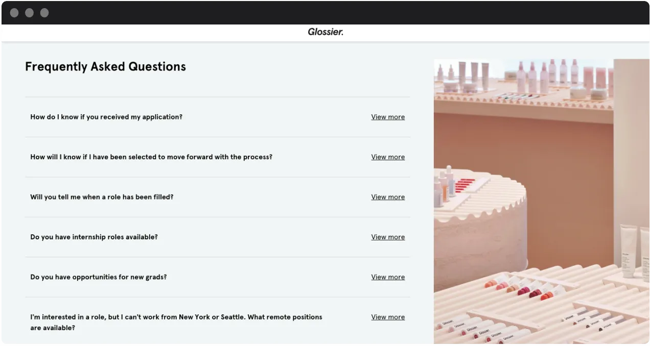 Glossier goes so far as to include FAQs on their career page specifically related to how they hire:
