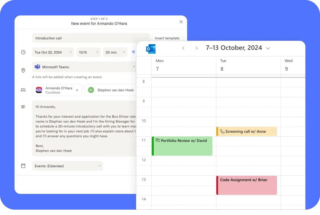 Connect your Outlook Calendar to your Homerun account and any event created in Homerun will automatically be added to the Outlook Calendar of your choice. Create events for candidate interviews and any other hiring-related events directly from your hiring pipeline. Any updates made in Homerun will automatically sync with Outlook Calendar, so your event organization is seamless and straightforward. Bonus: after creating an event, a Microsoft Teams meeting link is auto-generated and sent to attendees. This link can always be found in your event in Homerun and your Outlook Calendar, so candidates and team members always have the right link.