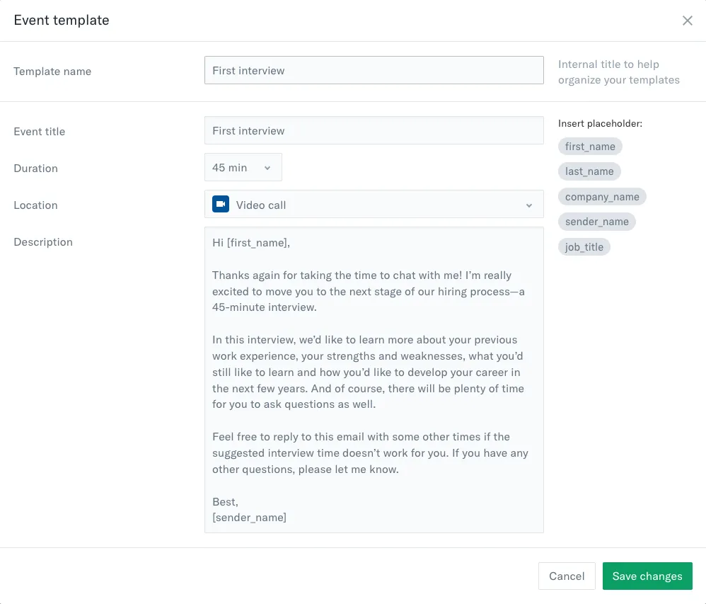 Event templates help you prepare for rounds of phone screens or interviews, and make sure that every candidate receives the correct information that they need. If you’re in charge of the hiring process or interviews, you can set up your event templates in advance for future communication. When it’s time to invite candidates, you (or a team member) can use your prepared template and not worry about having to add the right info – it’s already there!